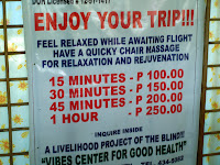 Durante el desayuno, hablamos con unos belgas sobre viajes. Emili recupera su pareo de Brasil tras comentarlo con la chica de la limpieza. Pagamos los 50 tradicionales pesos al tricicle para ir al aeropuerto, y en la espera para el embarque, Emili se hace un masaje con un masajista ciego (¡¡¡mmmmhhhh!!!)