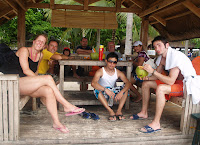 Nuestra última parada es en el Seven Comander, otra preciosa playa con bonitos fondos y que, para redondear la situación, tiene un chiringuito en el que tomamos cocos naturales y cervezas. El dueño, un manitas con el machete, nos esculpe una cuchara con la corteza del coco. Todo esto en medio de una interesante conversación entre unos filipinos, el americanos y la coreana que hacían las misma excursión con otra compañía, y nototros con el inglés (Oliver, como el guía).