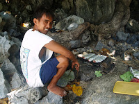 Nos levantamos a las 7 para estar a punto para la excursión y aún así nos pilla desayunando el simpático guía (no entendemos esta necesidad de hacernos madrugar para las excursiones). Nos vamos con la furgoneta a recoger al resto de compañeros de excursión. Las dos hora de excursión están amenizadas por el locuaz Harry y una paradita para descansar antes de llegar a Sabang. Serge se dejo la documentación necesaria para entrar al parque nacional. Al final, todo queda en un susto, y cogemos un barquito durante media hora que nos lleva a una preciosa playa. Andamos 500 m. por una jungla repleta de mosquitos hasta llegar al embarcadero definitivo, frente a la entrada del rio subterráneo. El paraje es de una gran belleza. Vamos con un grupito muy simpatico con un “capitán” más simpático aún (el rio es una corriente de agua que se mete en la montaña varios kilómetros, de los que se visitan kilómetro y medio).